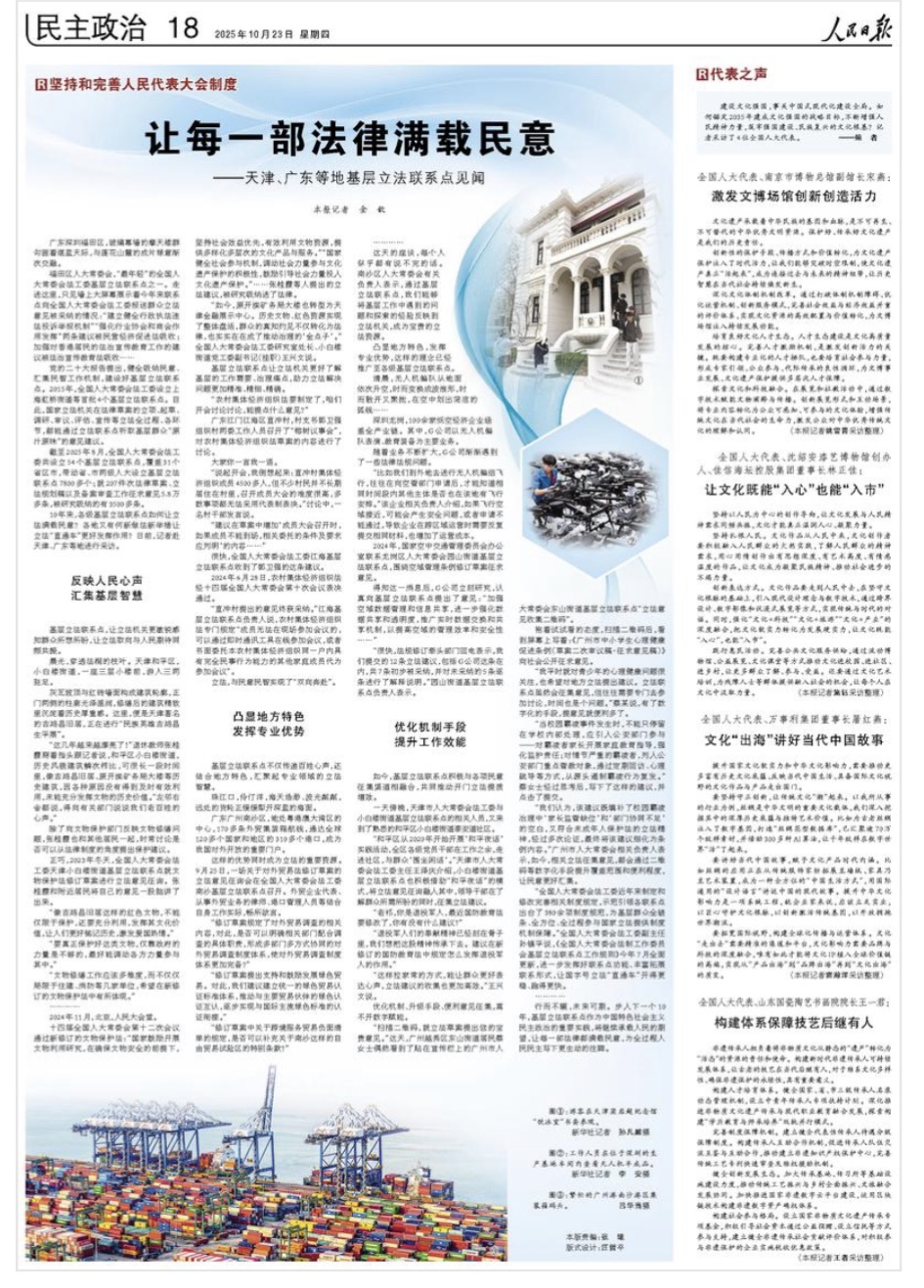 广东深圳福田区,玻璃幕墙的摩天楼群勾画着湛蓝天际,与莲花山麓的成片绿意渐次交融。 福田区人大常委会,“最年轻”的全国人大常委会法工委基层立法联系点之一。走进这里,只见墙上大屏幕展示着今年来联系点向全国人大常委会法工委报送群众立法意见被采纳的情况:“建立健全行政执法违法投诉举报机制”“强化行业协会和商会作用发挥”两条建议被民营经济促进法吸收;加强对香港居民的法治宣传教育工作的建议被法治宣传教育法吸收…… 党的二十大报告提出,健全吸纳民意、汇集民智工作机制,建设好基层立法联系点。2015年,全国人大常委会法工委设立上海虹桥街道等首批4个基层立法联系点。自此,国家立法机关在法律草案的立项、起草、调研、审议、评估、宣传等立法全过程、各环节,都能通过立法联系点听取基层群众“原汁原味”的意见建议。 截至2025年8月,全国人大常委会法工委共设立54个基层立法联系点,覆盖31个省区市,带动省、市两级人大设立基层立法联系点7800多个;就207件次法律草案、立法规划稿以及备案审查工作征求意见5.8万多条,被研究吸纳的有3500多条。 10年来,各级基层立法联系点如何让立法满载民意?各地又有何新做法新举措让立法“直通车”更好发挥作用?日前,记者赴天津、广东等地进行采访。 反映人民心声 汇集基层智慧 基层立法联系点,让立法机关更敏锐感知群众所想所盼,让立法取向与人民期待同频共振。 晨光,穿透法桐的枝叶。天津和平区,小白楼街道,一座三层小楼前,游人三两驻足。 灰瓦坡顶与红砖墙面构成建筑轮廓,正门两侧的柱廊光泽温润,修缮后的建筑精致里沉淀着历史厚重感。这里,便是天津著名的吉鸿昌旧居,正在进行“民族英雄吉鸿昌生平展”。 “这几年越来越漂亮了!”退休教师张桂霞掰着指头跟记者说,和平区小白楼街道,历史风貌建筑鳞次栉比,可很长一段时间里,像吉鸿昌旧居、原开滦矿务局大楼等历史建筑,因各种原因没有得到及时有效利用,未能充分发挥文物的历史价值。“左邻右舍都说,得向有关部门说说我们老百姓的心声。” 除了向文物保护部门反映文物修缮问题,张桂霞也和其他居民一起,时常讨论是否可以从法律制度的角度提出保护建议。 正巧,2023年冬天,全国人大常委会法工委天津小白楼街道基层立法联系点就文物保护法修订草案进行立法意见征询。张桂霞和附近居民将自己的意见一股脑讲了出来。 “像吉鸿昌旧居这样的红色文物,不能仅限于保护,还要充分利用,发挥其文化价值,让人们更好铭记历史,激发爱国热情。” “要真正保护好这类文物,仅靠政府的力量是不够的,最好能调动各方力量参与其中。” “文物修缮工作应该多维度,而不仅仅局限于住建、消防等几家单位,希望在新修订的文物保护法中有所体现。” ………… 2024年11月,北京,人民大会堂。 十四届全国人大常委会第十二次会议通过新修订的文物保护法:“国家鼓励开展文物利用研究,在确保文物安全的前提下,坚持社会效益优先,有效利用文物资源,提供多样化多层次的文化产品与服务。”“国家健全社会参与机制,调动社会力量参与文化遗产保护的积极性,鼓励引导社会力量投入文化遗产保护。”张桂霞等人提出的立法建议,被研究吸纳进了法律。 “如今,原开滦矿务局大楼也转型为天津金融展示中心。历史文物、红色资源实现了整体盘活,群众的真知灼见不仅转化为法律,也实实在在成了推动治理的‘金点子’。”全国人大常委会法工委研究室处长、小白楼街道党工委副书记(挂职)王兴文说。 基层立法联系点让立法机关更好了解基层的工作需要、治理痛点,助力立法解决问题更加精准、精细、精确。 “农村集体经济组织法要制定了,咱们开会讨论讨论,能提点什么意见?” 广东江门江海区直冲村,村支书郭卫强组织村两委工作人员召开了“榕树议事会”,对农村集体经济组织法草案的内容进行了讨论。 大家你一言我一语。 “说起开会,我倒想起来:直冲村集体经济组织成员4500多人,但不少村民并不长期居住在村里,召开成员大会的难度很高,多数事项都无法采用代表制表决。”讨论中,一名村干部发言说。 “建议在草案中增加‘成员大会召开时,如果成员不能到场,相关委托的条件及要求应列明’的内容…” 很快,全国人大常委会法工委江海基层立法联系点收到了郭卫强的这条建议。 2024年6月28日,农村集体经济组织法经十四届全国人大常委会第十次会议表决通过。 “直冲村提出的意见终获采纳。”江海基层立法联系点负责人说,农村集体经济组织法专门规定“成员无法在现场参加会议的,可以通过即时通讯工具在线参加会议,或者书面委托本农村集体经济组织同一户内具有完全民事行为能力的其他家庭成员代为参加会议”。 立法,与民意民智实现了“双向奔赴”。 凸显地方特色 发挥专业优势 基层立法联系点不仅传递百姓心声,还结合地方特色,汇聚起专业领域的立法智慧。 珠江口,伶仃洋,海天浩渺、波光粼粼,远处的货轮正缓缓犁开深蓝的海面。 广东广州南沙区,地处粤港澳大湾区的中心,170多条外贸集装箱航线,通达全球120多个国家和地区的310多个港口,成为我国对外开放的重要门户。 这样的优势同时成为立法的重要资源。9月25日,一场关于对外贸易法修订草案的立法意见征询会在全国人