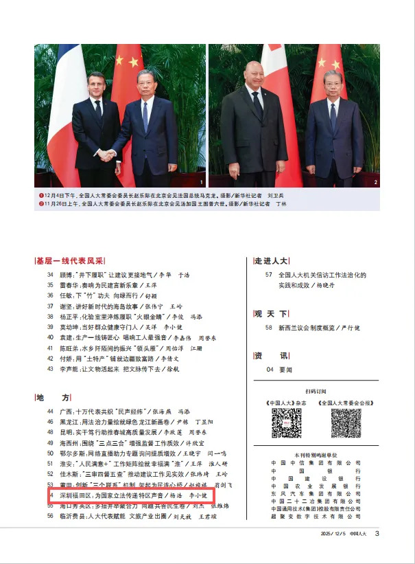 2025年12月5日出版的《中国人大》杂志2025年第23期,刊发了《深圳福田区:为国家立法传递特区声音》,现转发。