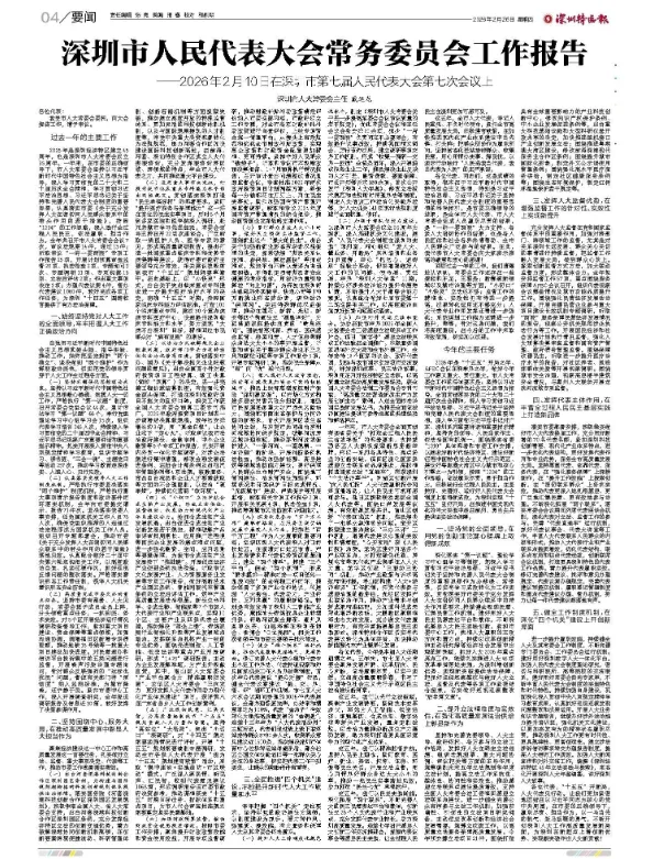 ——2026年2月10日在深圳市第七届人民代表大会第七次会议上 深圳市人大常委会主任 戴运龙 各位代表: 我受市人大常委会委托,向大会报告工作,请予审议。 过去一年的主要工作 2025年是深圳经济特区建立45周年,也是深圳市人大常委会成立35周年。一年来,在市委的正确领导下,市人大常委会坚持以习近平新时代中国特色社会主义思想为指导,深入学习贯彻党的二十大和二十届历次全会精神,学习贯彻习近平法治思想、习近平总书记关于坚持和完善人民代表大会制度的重要思想,认真落实市委《关于充分发挥人大在密切同人民群众联系中的带头作用的若干措施》,按照“1234”的工作思路,深入践行全过程人民民主,依法履职、担当作为。全年共召开市人大常委会会议7次,审议法规案14件,通过13件;听取审议“一府一委两院”专项工作报告25项,开展计划预算审查监督20项、执法检查2项、专题询问3次、专题调研11项、专项视察15项、立法后评估2项;作出重大事项决定3项;办理代表议案4件,督办代表建议1060件,较好完成各项工作任务,为深圳“十四五”圆满收官提供了有力法治保障。 一、始终坚持党对人大工作的全面领导,牢牢把握人大工作正确政治方向 自觉用习近平新时代中国特色社会主义思想武装头脑、指导实践、推动工作,始终把坚定拥护“两个确立”、坚决做到“两个维护”作为鲜明政治底色,切实把党的领导贯穿于人大工作全过程各方面。 (一)坚持不懈强化思想理论武装。坚持以习近平新时代中国特色社会主义思想凝心铸魂、统揽人大一切工作,严格执行“第一议题”制度,召开常委会党组会议44次,累计传达学习“第一议题”66个,举行党组理论学习中心组学习会15次,组织代表学习培训245人次,持续深入学习贯彻党的二十届四中全会精神、习近平总书记视察广东重要讲话和重要指示精神。扎实开展深入贯彻中央八项规定精神学习教育,组织专题学习、读书班、“三会一课”、主题党日等活动257次,推动学习教育走深走实、入脑入心、见行见效。 (二)认真落实党领导人大工作制度机制。严格执行市委坚决落实“两个维护”制度机制,严格执行重大事项请示报告制度和政治要件闭环落实机制,全年向市委提交请示、报告71件次。坚决落实党委人事安排,任免国家机关工作人员78人次,确保党组织推荐的人选通过法定程序成为国家机关工作人员。组织召开专题部署会,推动市委《关于充分发挥人大在密切同人民群众联系中的带头作用的若干措施》落地见效。认真配合做好二十届中央第六轮巡视相关工作,以高度政治自觉、扎实过硬作风,抓好巡视反馈问题的整改落实。严格落实意识形态工作责任制,筑牢人大机关意识形态安全防线。 (三)高质量完成市委交办的重点任务。坚持市委有部署、人大见行动,常委会班子成员全员上阵,分头领衔重点任务,一抓到底、务求实效。对5个区开展经济运行情况调研检查督导工作,紧扣重大项目建设、资金保障等重点领域,加强沟通协调,调增福田区新增专项债限额,推动地铁15号线等一批重大项目建设加快进度。对民意速办和信访平台投诉集中的五类问题进行监督,开展噪声污染治理专题询问,针对群众反映强烈的“达标也扰民”问题,督促有关部门将“烦恼度”纳入监测标准,为城市降噪,还宁静于民。紧扣市委中心工作,深入开展调查研究,全年报送调研报告及信息近30篇,较好发挥了决策参谋作用。 二、坚持围绕中心、服务大局,在推动高质量发展中彰显人大担当作为 聚焦经济建设这一中心工作和高质量发展这一首要任务,扎实做好立法、监督、重大事项决定、代表等工作,推动市委工作部署落实落细。 (一)出台河套深港科技创新合作区深圳园区条例,为构建与国际规则相衔接的科技创新规则体系提供法治保障。落实国务院《河套深港科技创新合作区深圳园区发展规划》,积极争取全国人大、省人大常委会支持,出台河套深港科技创新合作区深圳园区条例,充分发挥经济特区立法的创新变通优势,着力破解深港协同创新机制瓶颈,在创新要素跨境便捷流动、科研管理体制、创新容错机制等方面探索突破,推动建立高度开放的特殊监管体系、更加灵活的科技创新体制机制,以及与国际规则接轨的人才制度等,将党中央重大决策部署转化为法规规范,助力河套合作区加快建设国际科技创新高地。在前海、河套、深汕特别合作区成立人大代表联络站,充分发挥联络站跨区域、跨领域的特点,举全市人大代表之力,共同推动重大平台建设。 (二)运用重大事项决定权,对提升我市临床重点专科能力水平作出刚性规定。贯彻落实深圳打造“民生幸福标杆”的部署要求,紧盯“提升医疗服务与保障能力”这一排在首位的民生实事项目,历时8个月到多家医院和医学院深入调研,赴兄弟城市学习先进经验,常委会领导主持召开22场次座谈会,广泛听取一线医护人员、医学专家的意见,形成高质量调研报告,提出打造一批国家重点临床专科和优势专病集群等建议,获得市委市政府主要领导充分肯定,相关建议被吸纳到我市“十五五”规划纲要草案中。在此基础上,以“小快灵”形式,出台关于突出临床重点专科建设进一步提升医疗治疗水平的决定,明确“十五五”时期,按照国家临床专科能力评估标准,打造100个临床重点专科,建成30个重点疾病专科